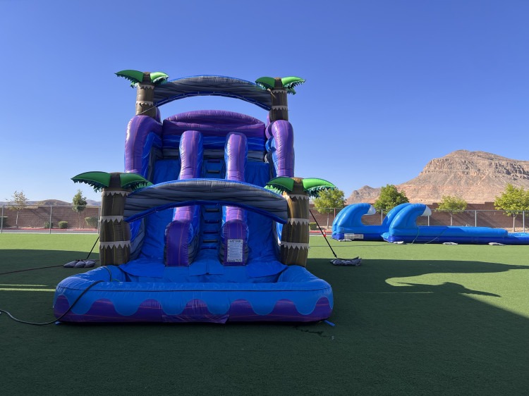 Make a splash after dark (or all day long) with our Midnight Tropics Dual Lane Water Slide – a vibrant and exciting inflatable perfect for summer parties and backyard fun! This stunning purple and blue slide features two thrilling lanes, palm tree accents, and a deep splash pool at the bottom for endless wet and wild excitement.